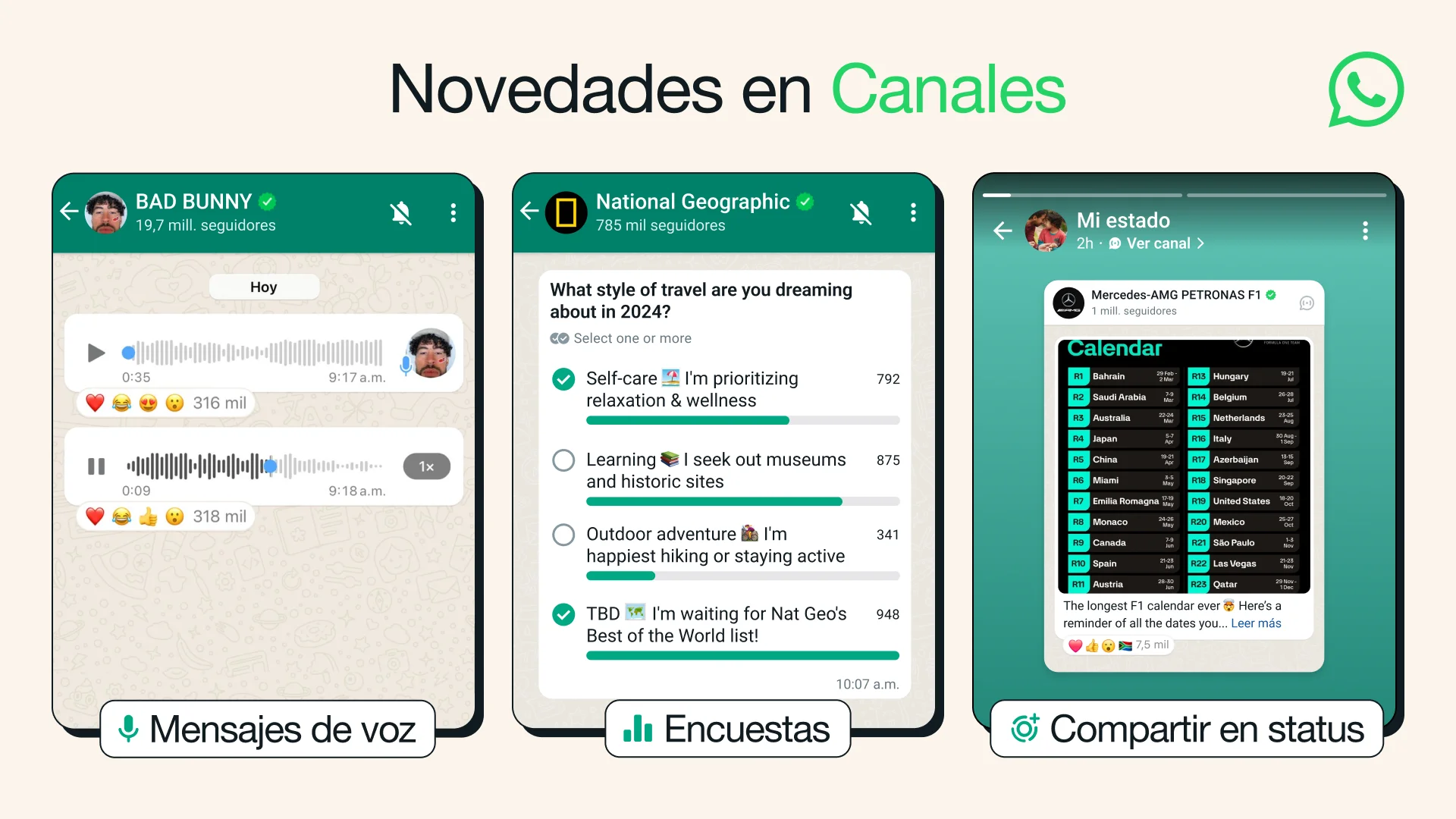 Ahora, los administradores de los Canales pueden enviar mensajes de voz a sus grupos. Una posibilidad de lo más interesante teniendo en cuenta la cantidad de mensajes de voz enviados por WhatsApp al cabo del día, más 7 mil millones. Y lo mejor es que puedes escuchar actualizaciones rápidas de tus canales favoritos sin tener que leer textos largos.
