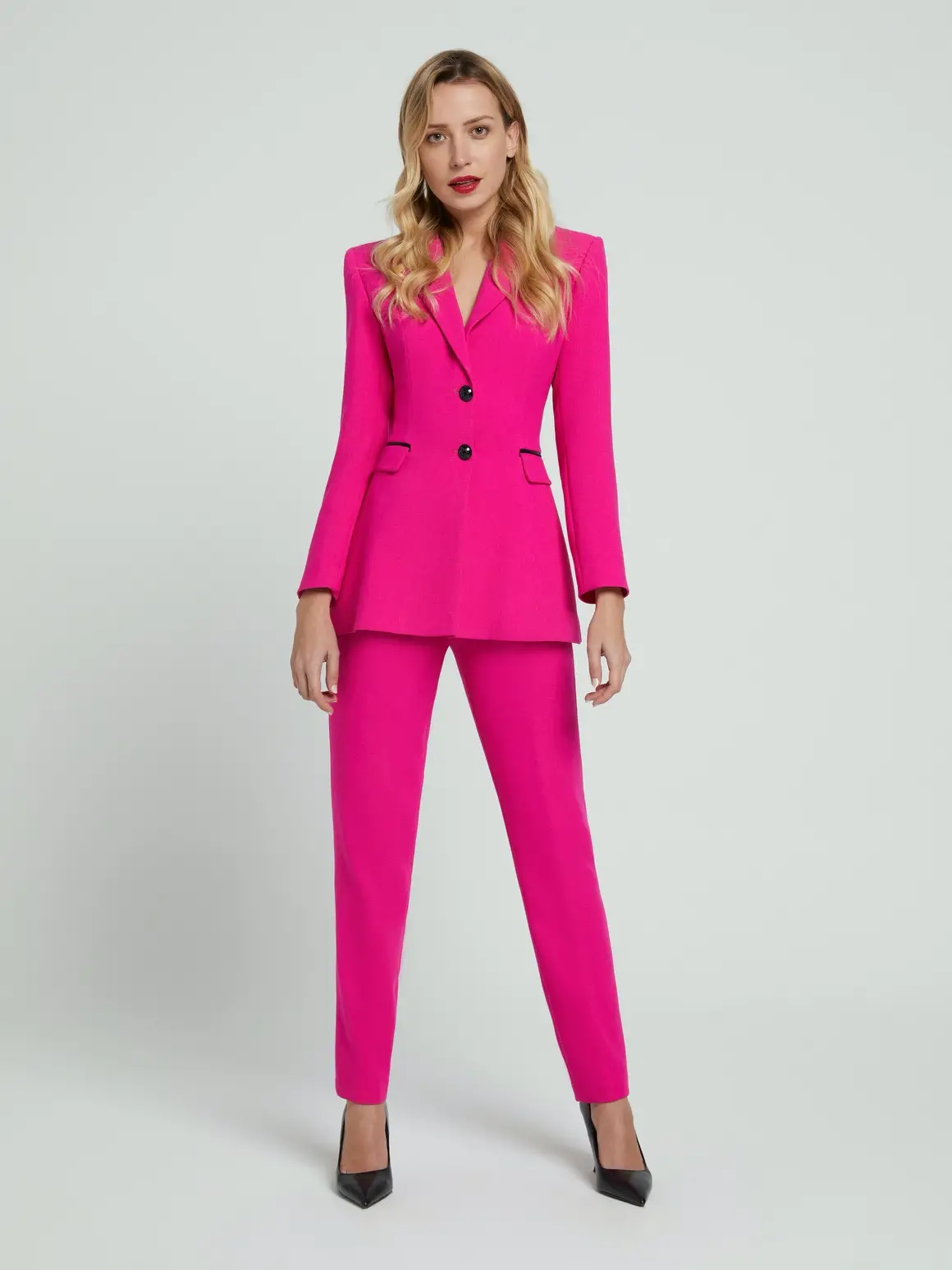 El traje esta realizado en un tejido italiano de alta calidad de doble capa, y ofrece comodidad de movimiento, algo que seguro que tuvo muy en cuenta la presentadora. El patrón de la blazer esta inspirado en las casacas de amazona del siglo XIX con doble apertura trasera. Los botones lacados en negro le aportan un detalle de sofisticación, y el resto de los detalles en negro están hechos con un tejido técnico aterciopelado mate, con la idea de potenciar el contraste y la limpieza de formas del diseño.
