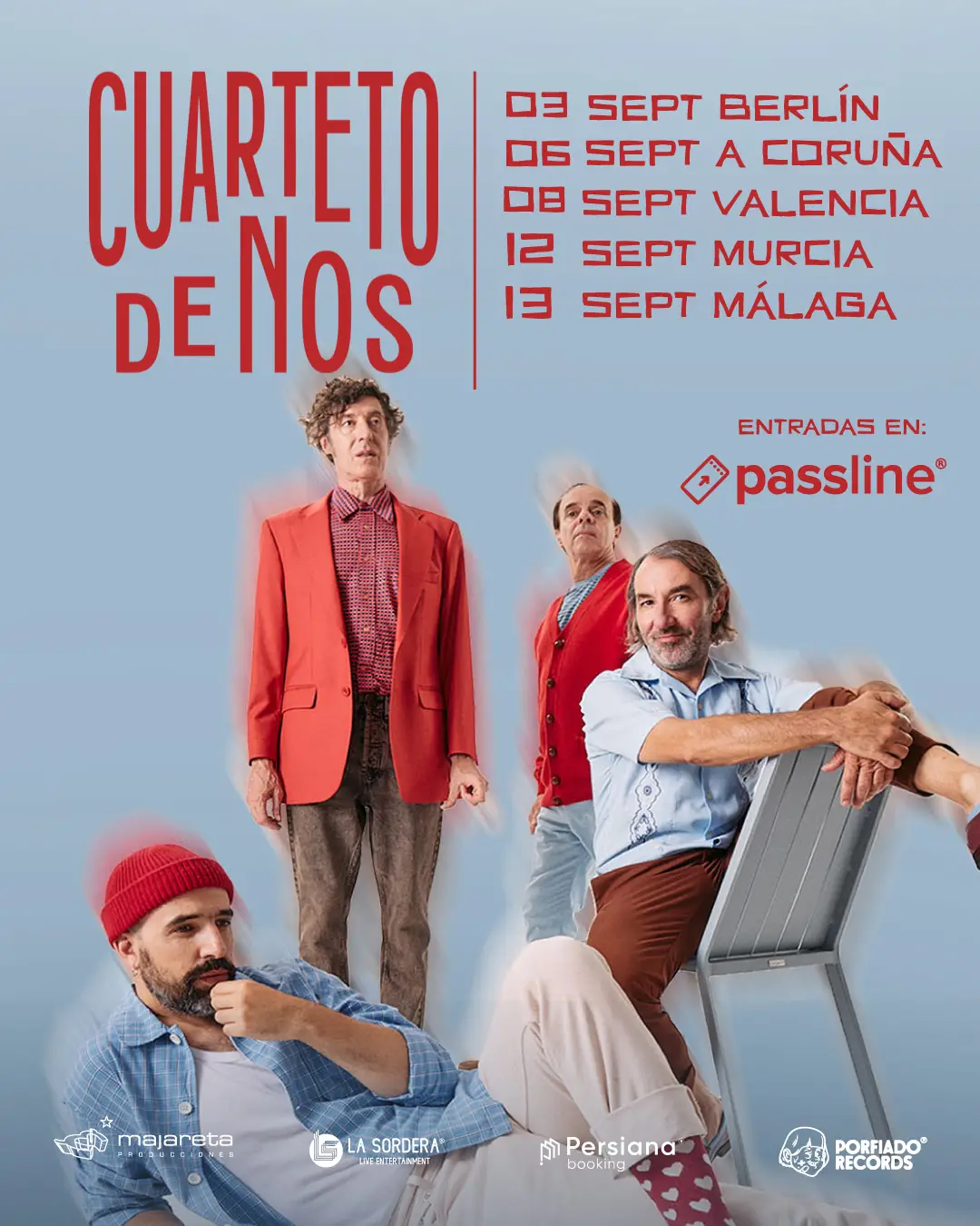Cuarteto de Nos, o lo que es lo mismo Roberto Musso, Álvaro Pintos, Gustavo Antuña y Santiago Marrero, prometen conciertos con mucha marcha, con un set list que incluye un amplio catálogo de hits, y el estreno en directo de varias canciones de su nuevo disco. Todo en este regreso a Europa. Y tú no te lo puedes perder.