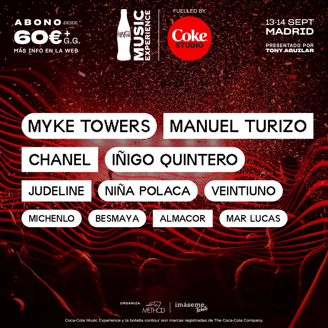 El cartel de Coca-Cola Music Experience crece con cinco nuevos artistas que debutarán en esta decimocuarta edición. Los próximos días 13 y 14 de septiembre la marca apuesta por la diversidad de estilos, y va reunir en el mismo escenario a artistas consagrados y emergentes, a los mejores del panorama musical. Llegan nombres de artistas tan importantes como Myke Towers, Íñigo Quintero, Veintiuno, Judeline y Michenlo.